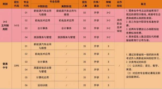 学校开设了机电技术应用、新能源汽车运用与维修、旅游服务与管理、会计事务、计算机应用、运动训练等13个专业,并建立了完善的校内、校外实训基地,现有三年制高职、3+2五年制高职、三年制中专三种办学层次,建有汽车、机电、旅游、电子等4个国家级示范专业以及4个省级示范特色专业、2个省级优质专业;4个省级示范实训基地,2个省级名师工作坊。